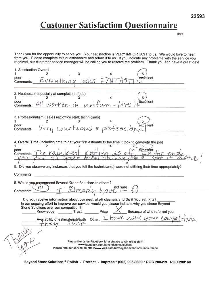 Most sealers and enhancers used on exterior surfaces in Arizona will break down and fade within a couple of years. The reason we prefer using Dry Treat sealers on exterior surfaces is that it can be expected to last much longer before another application is needed (although it is still recommended to be professionally deep cleaned every one to two years). There are some Dry Treat sealers that come with five, fifteen, or twenty-five year written warranties against the absorption of water and oil, but only if the sealer is applied by a Dry Treat accredited applicator and a regular cleaning schedule is maintained. Beyond Stone Solutions is a Dry Treat accredited applicator, and we will be happy to provide proof of treatment for your records, as well as answer any questions you may have about Dry Treat sealers and products.